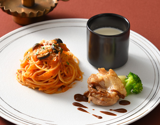 蓮根のポタージュ、鶏もも肉のロースト オレンジ風味のチョコレートソース、アマトリチャーナ