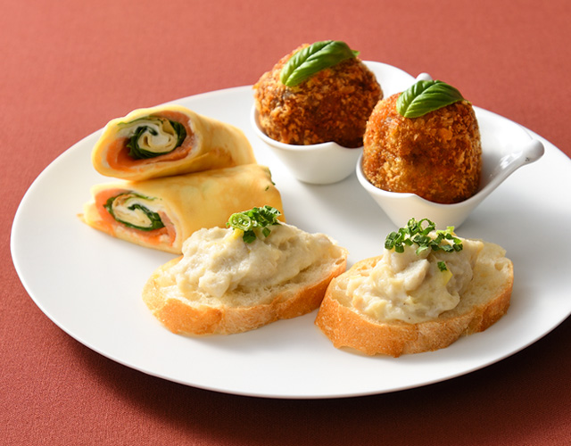 ■下段/スモークサーモンのクレープ・サレ、イカ墨のアランチーニ、里芋と柚子胡椒のカナッペ