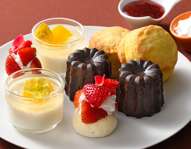 ■中段/プレーンカヌレ、ホワイトメレンゲ、オレンジパンナコッタ、クラシックスコーン(ホテルメイドのいちごジャム、クロテッドクリーム)
