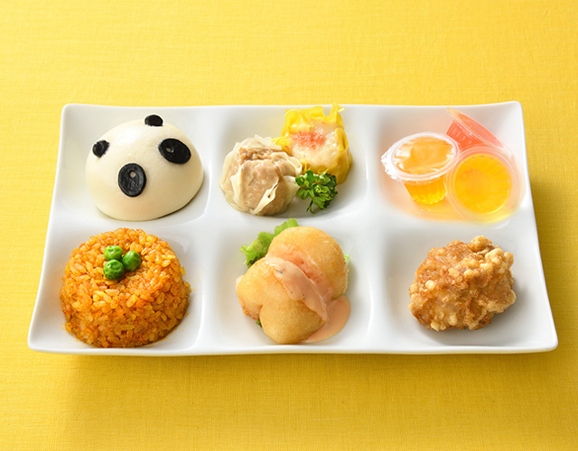 【中華】海老のフリッター マヨネーズソース/鶏の唐揚げ/焼売二種/カレー炒飯/パンダまん/コーンスープ/フルーツゼリー