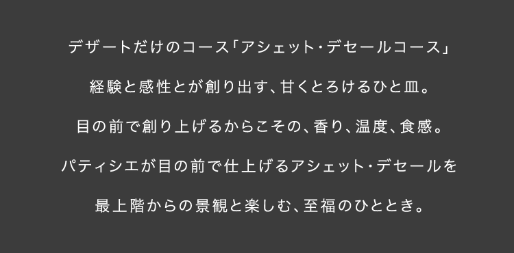 16階、地上60メートルからの眺望とともにお楽しみください。![]() 【ご利用案内】 こちらは90分間の、デザートのみのコースプランとなります。 ・中学生以下のお子様のご来店はご遠慮ください。 ・香りの強い香水をつけてのご来店は、ご遠慮いただきますようお願いいたします。 |