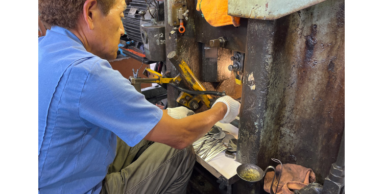 | 小林/ | びっくりしたでしょう?フォークを一本作るにも、型は一つじゃないんです。抜き、バリ取りと呼ばれる研磨、磨き、時には飾り。熟練した職人が手作業で行っています。 |