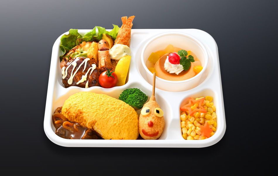 | お品書き | ピザ風サーモンソテー/照り焼きハンバーグ/海老フライ タルタルソース レモン/タコさんウインナー/フライドポテト ミニトマト/ミニアメリカンドック/コーンバターと星型人参のグラッセ/オムライス 茸入りデミグラスソース ブロッコリー/プリンアラモード フルーツのコンポート 〈特定原材料〉卵・小麦・乳成分・えび |