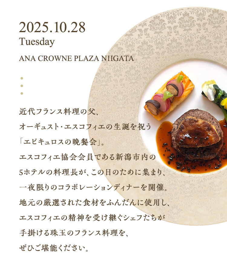 その後、大戦などの影響で中断していましたが、2008年にエスコフィエの料理理念や技術を尊敬する世界各国の料理長たちによって「エピキュロスの晩餐会」は復活し、エスコフィエの誕生日である10月28日前後に開催されています。